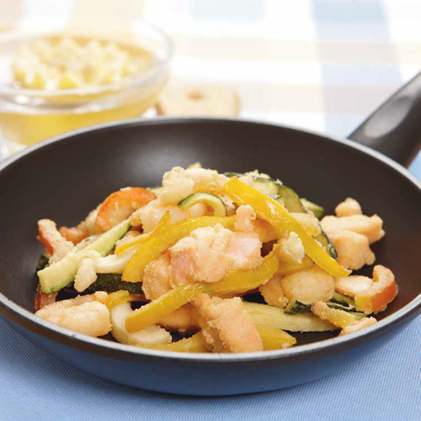 - Skär bläckfiskarna i remsor och laxen i bitar. Skala zucchinin och paprikorna och skär till medelstora stavar.