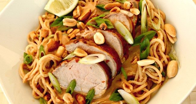 • Separera över nudlarna i fyra skålar, toppa med fläskfilé och garnera med överbliven sås, jordnötter och ev. skivad salladslök.