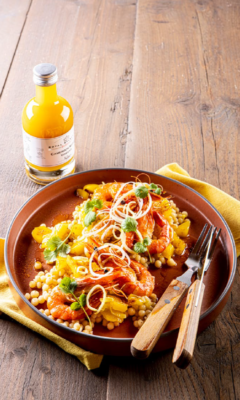- Blanda i cirka ½ dl olivolja och mangovinägern med couscousen.5 cl Belberry Mangovinäger